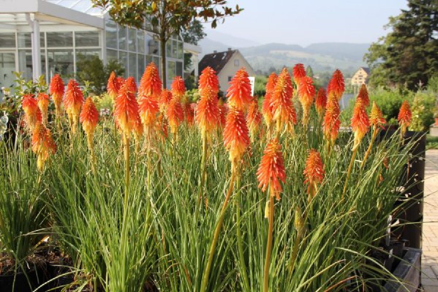 Wer das Beetpaket ‚Leuchtfeuer‘ pflanzt, sorgt für fröhliche Farbtupfer von April bis Oktober. Den Auftakt bildet im April lila Blaukissen, das im Mai rasch Begleitung von violettem Ziersalbei, limettenfarbiger Walzenwolfsmilch und orangefarbenem Sonnenröschen erhält. Kommt der Hochsommer läuft auch das Beet zu Hochformen auf. Nun folgen die exotisch anmutende Fackellilie mit ihren bürstenförmigen Blüten, aromatische Indianernessel in Blutrot, duftende Hohe Flammenblume, strahlend gelber Alant, lilablaue Knäuelglockenblume sowie blühfreudige Taglilien. Im Spätsommer und Frühherbst ergänzen orangefarbene Sonnenbraut und samtig-violette Raublattaster das Ensemble. Für die nötige Struktur im Beet sorgen Ziergräser wie Garten-Reitgras und hohes Chinaschilf. Ab Juli bilden sie ihre Blüten aus. Dabei formt das Reitgras straff aufrechte Halme, die sich sanft im Wind wiegen, während das Chinaschilf im Herbst mit atemberaubenden, federartigen Samenständen aufwartet, die an die Silberregen eines Feuerwerks erinnern.