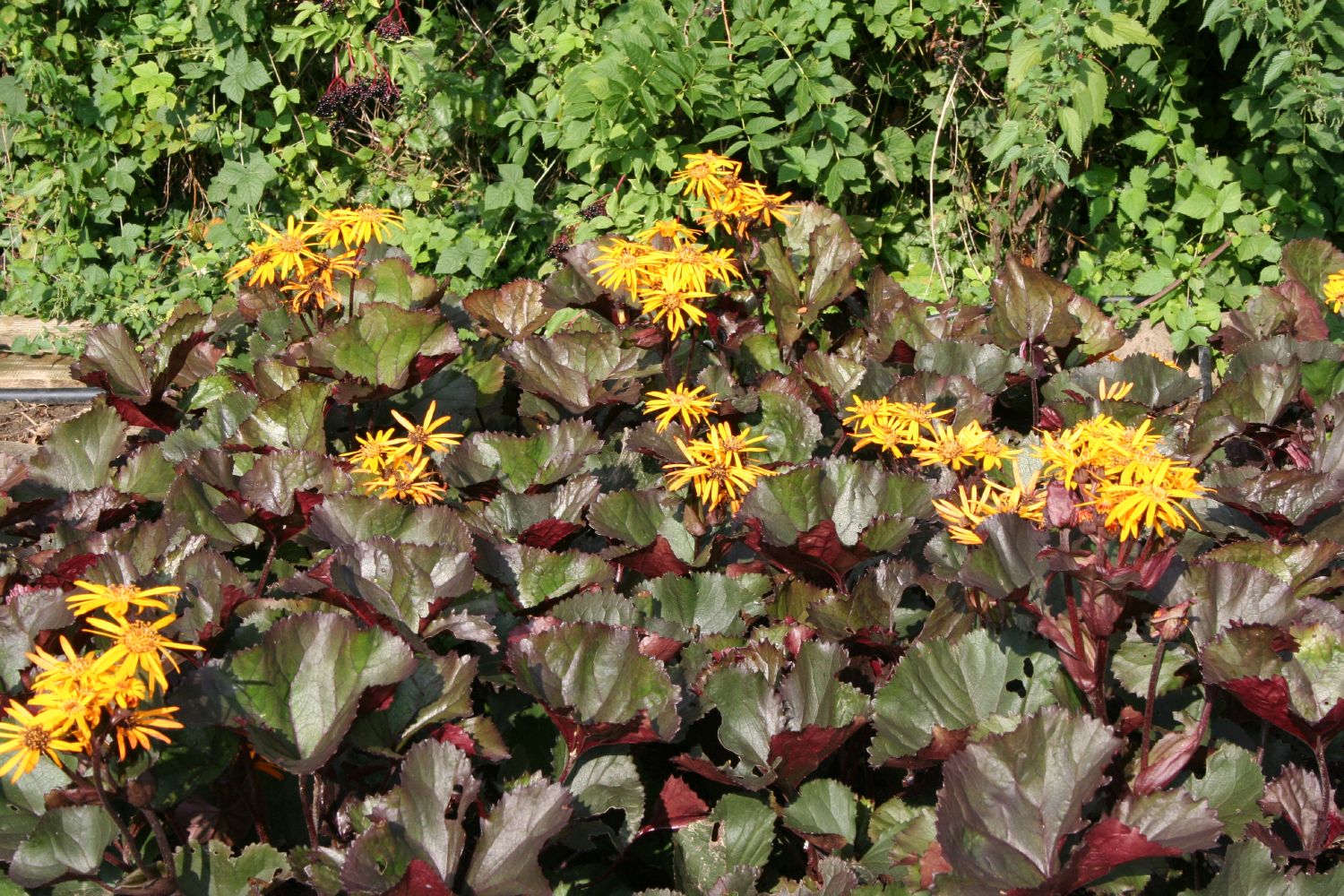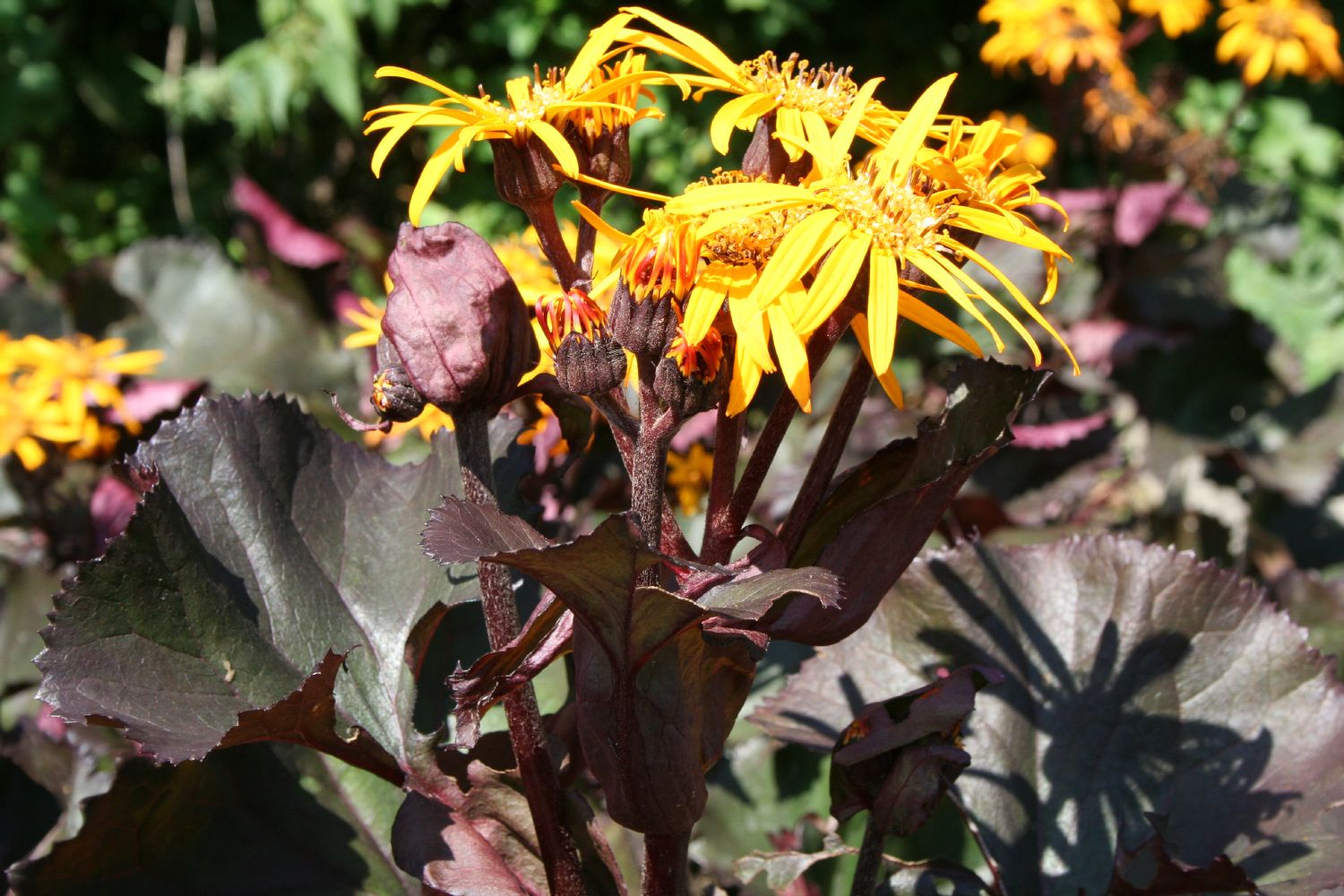 Für effektvolle Hell-Dunkel-Kontraste ist diese Solitärstaude wie gemacht. Schon in sich selbst realisiert das Purpur-Greiskraut zur Blütezeit im Sommer ein spannungsreiches Zusammenspiel zwischen dunklem Laub, schwarzroten Trieben und kräftig gelb-orangefarbenen Blüten.