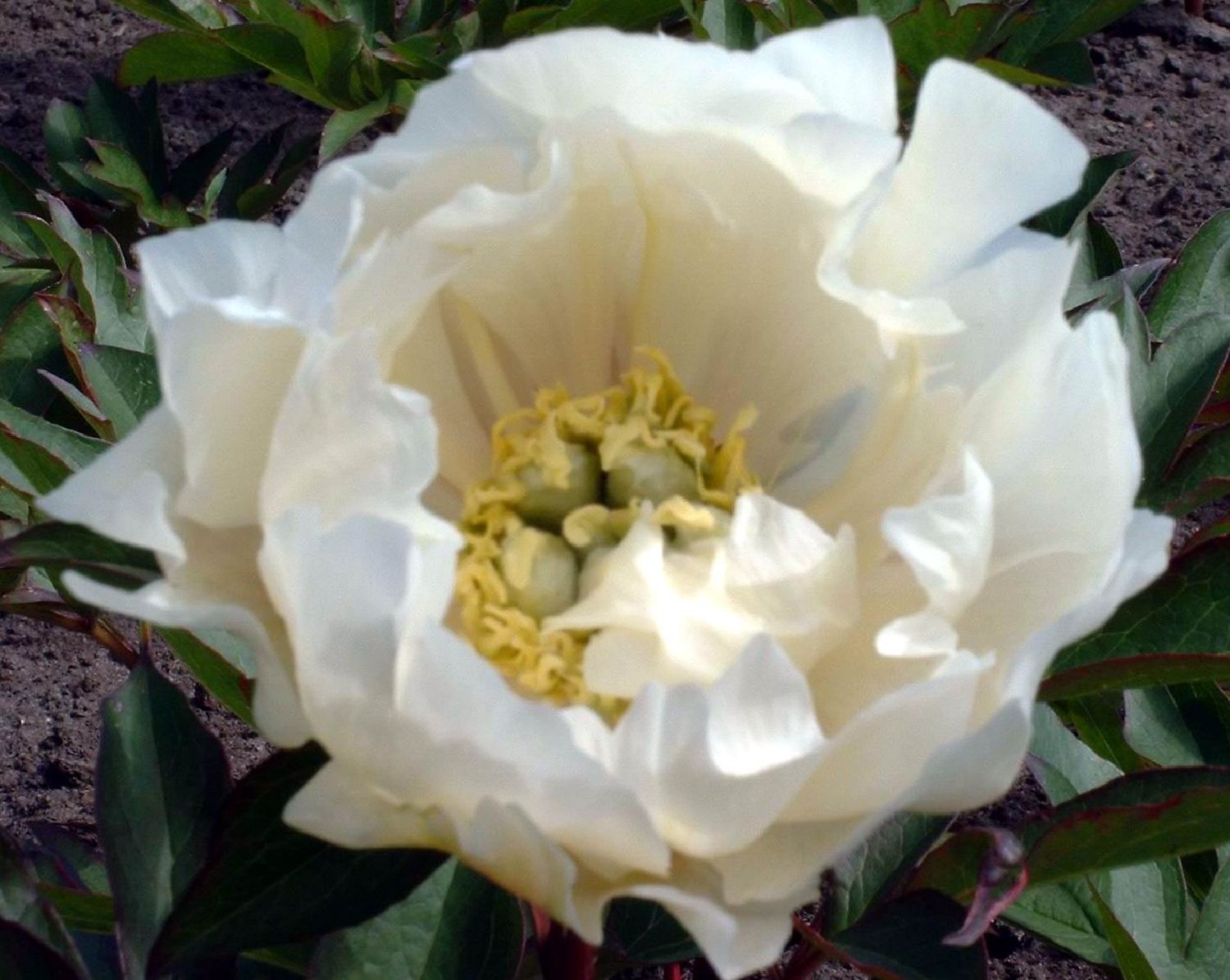 Paeonia Itoh-Hybride 'White Emperor' ist eine seltene Pfingstrosen-Sorte und erstrahlt in reinem Weiß mit einer halbgefüllten Blütenform.