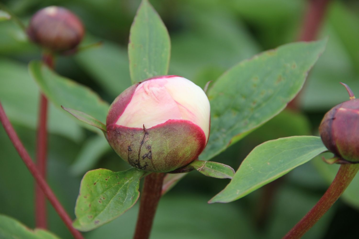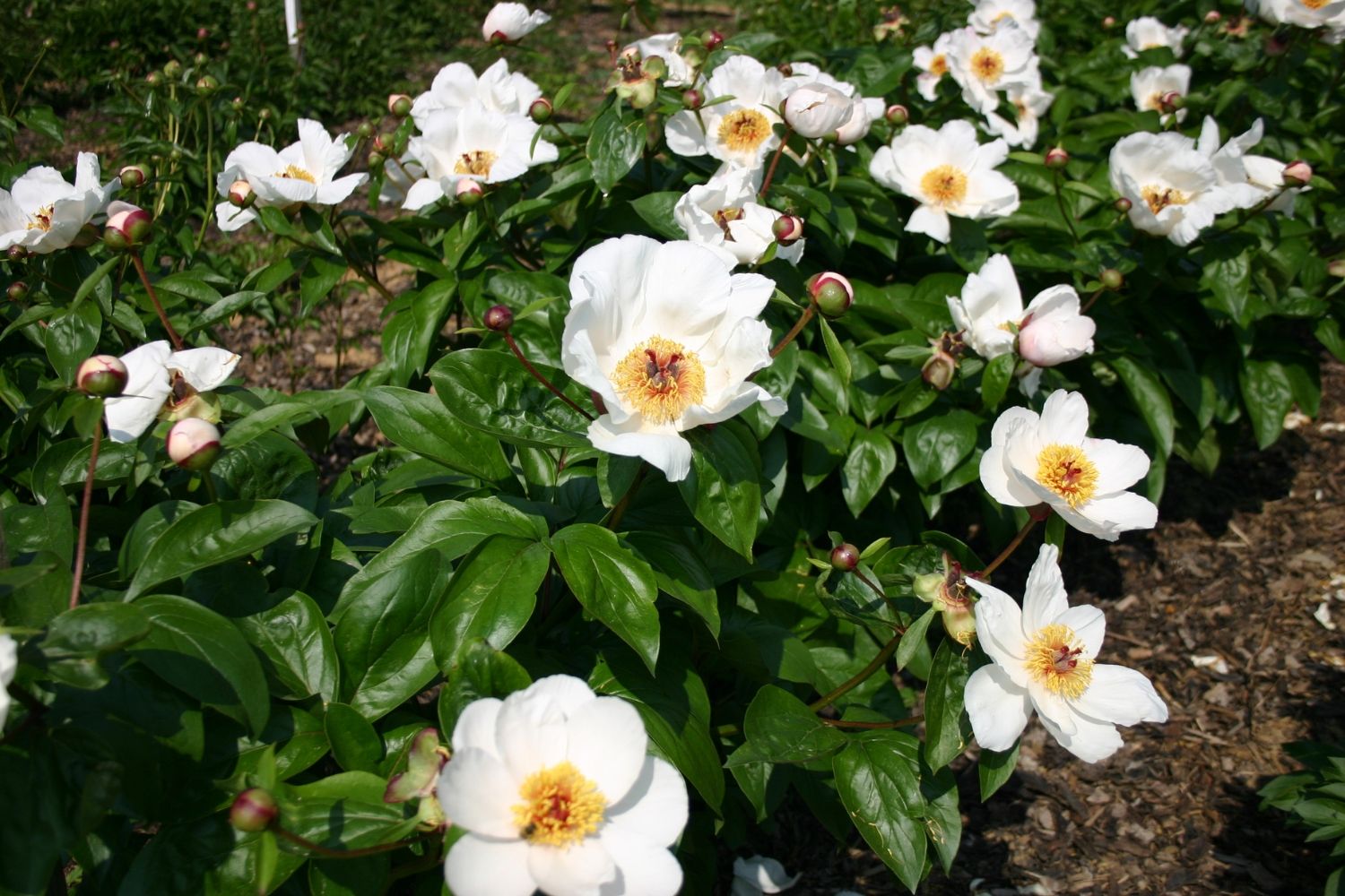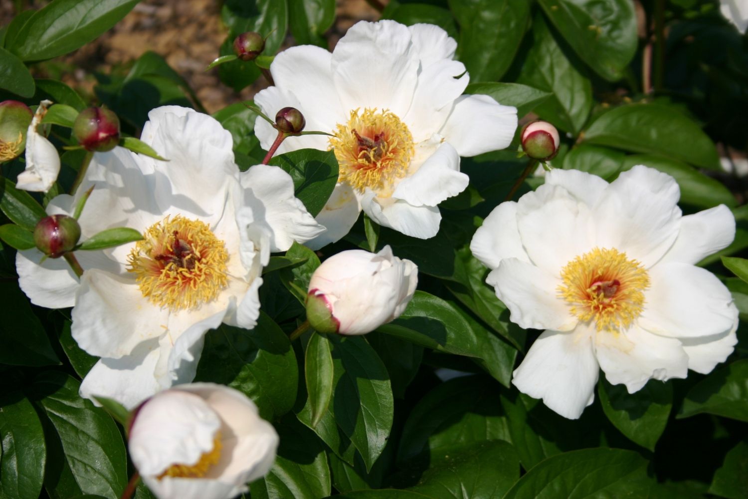 (USA Saunders 1941). Diese Kreuzung zwischen P. lactiflora und P. wittmanniana bringt mehrere Blüten pro Stiel hervor. Die großen einfachen Blüten, die auf roten Stielen sitzen, sind weiß und haben ein goldfarbenes und karminrotes Zentrum. Beeindruckende Wirkung! Blütezeit: Anfang Mai