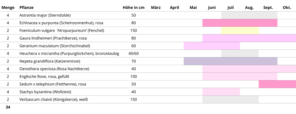 Die Stars des Beetes sind zwei zartrosa, gefüllt blühende Englische Rosen mit gutem Duft, die für die nötige Höhe und Struktur sorgen. Diese werden blütenreich begleitet von Stauden wie Storchschnabel, Katzenminze, Purpursonnenhut, Sterndolde und weißer Königskerze. Feinblättriger Purpurfenchel sorgt zusätzlich für kontrastierende Blattstruktur, ebenso wie das immergrüne Purpurglöckchen, dessen hübsche Blatthorste auch im Winter erhalten bleiben. Trockenheitsliebende Stauden wie die dauerblühende Prachtkerze mit ihren kleinen rosa Schmetterlingsblütchen, im Herbst blühende Fetthennen sowie zauberhafte rosa Teppichnachtkerzen sorgen für die perfekte Ergänzung des Ensembles. Gerade letztere kommen an der Natursteinmauer besonders schön zur Geltung, da sie an der Mauerkante etwas überhängen können.