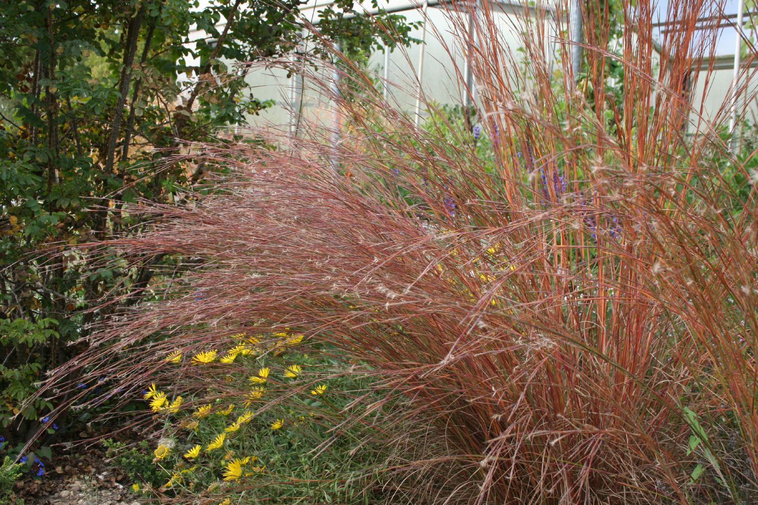 Ein strukturstarker Gräservertreter aus den nordamerikanischen Prärien ist das Prärie-Bartgras Schizachyrium scoparium 'Cairo', das sich durch seine fast architektonisch-aufrechte Form auszeichnet. Im Sommer sind seine Halme graugrün gefärbt. Kommt jedoch der Herbst färben sich die Blattstängel wundervoll bräunlich-weinrot. Dazu bildet das Prärie-Bartgras kleine, cremeweiße Blütchen, die im Gegenlicht der Sonne wie winzige, plusterige Daunenfedern aussehen.