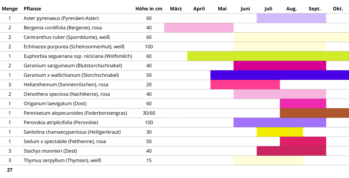 Wann blüht was und wie hoch werden die Pflanzen? in unserem Blütezeitkalender sehen Sie alle Bestandteile des Beet-Sets.