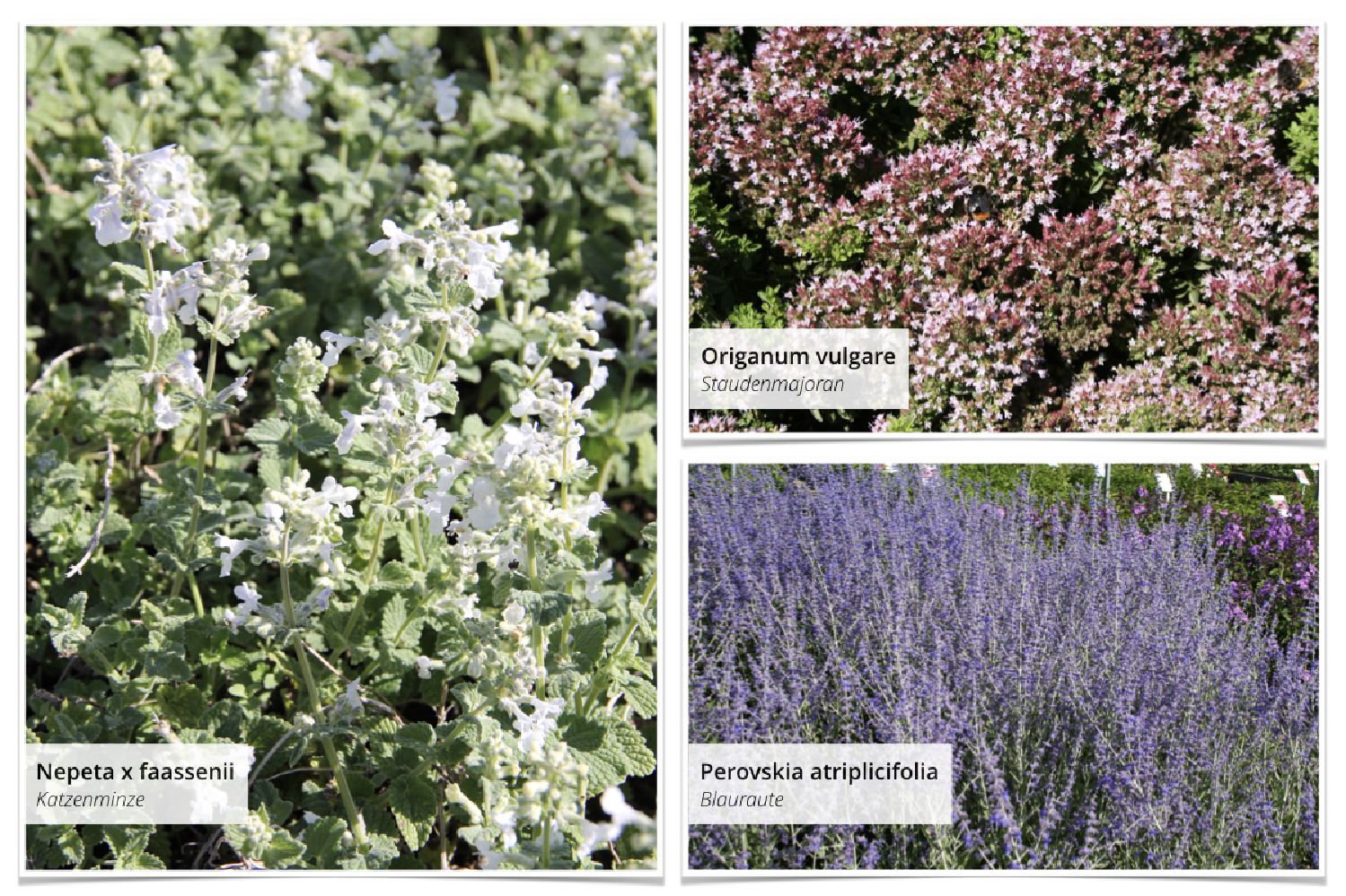 Sich aus der „Versteinerung“ zu lösen kann jedoch etwas äußerst Belebendes haben, wie dieses Beispiel eines ehemals tristen Vorgartens zeigt. Auf 2,5 m² versammelt sich nicht nur eine üppige Blütenprachtsondern auch nektarreiche Pflanzen, die vom späten Frühjahr bis in den Herbst hinein Bienen, Hummeln und Schmetterlinge anziehen und so für eine willkommene Belebung des Vorgartens sorgen. Das Pflanzenensemble in kühler Farbgebung wird von einer ungefüllt blühenden Bienenweide-Rose angeführt. Diese ist umgeben von Hoher Flammenblume, Duftnessel, Blauraute, weißem Sonnenhut, Sommer- und Herbstaster, weißer Fetthenne, Steinquendel und Katzenminze sowie aromatischen Polsterstauden wie Teppichthymian und Staudenoregano. Nicht fehlen darf natürlich auch duftender Lavendel.