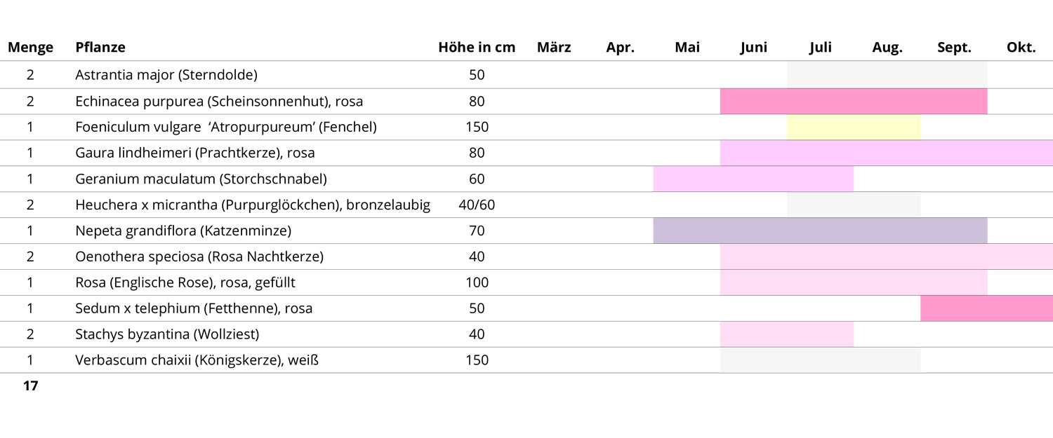 Das Beet mit seinen pflegeleichten Stauden blüht vom Frühsommer bis zum Herbst, mit Höhepunkt im Sommer. Dieser Traum in Rosa ist pure Romantik!