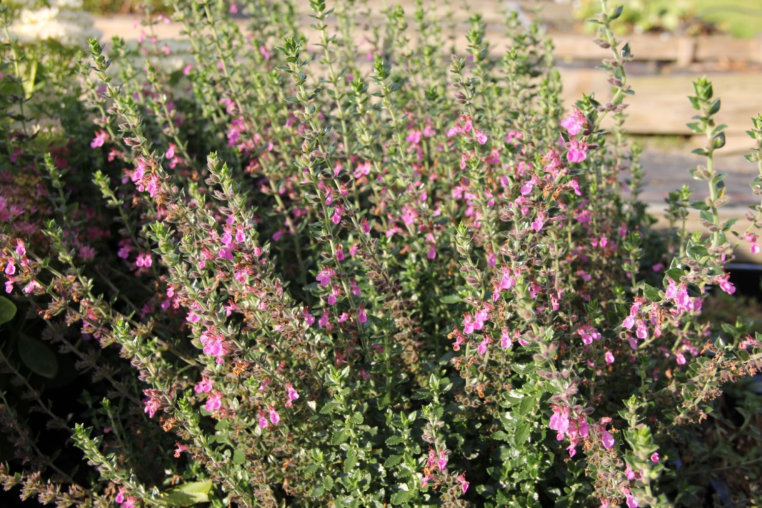 Immergrüner Zwergstrauch mit glänzend grünen Blättern und rosalila Blüten. Für sonnige Lagen im Stein-, Heide- oder Gräsergarten. Läßt sich auch als Einfassung verwenden und ist ein guter Buchsersatz.
