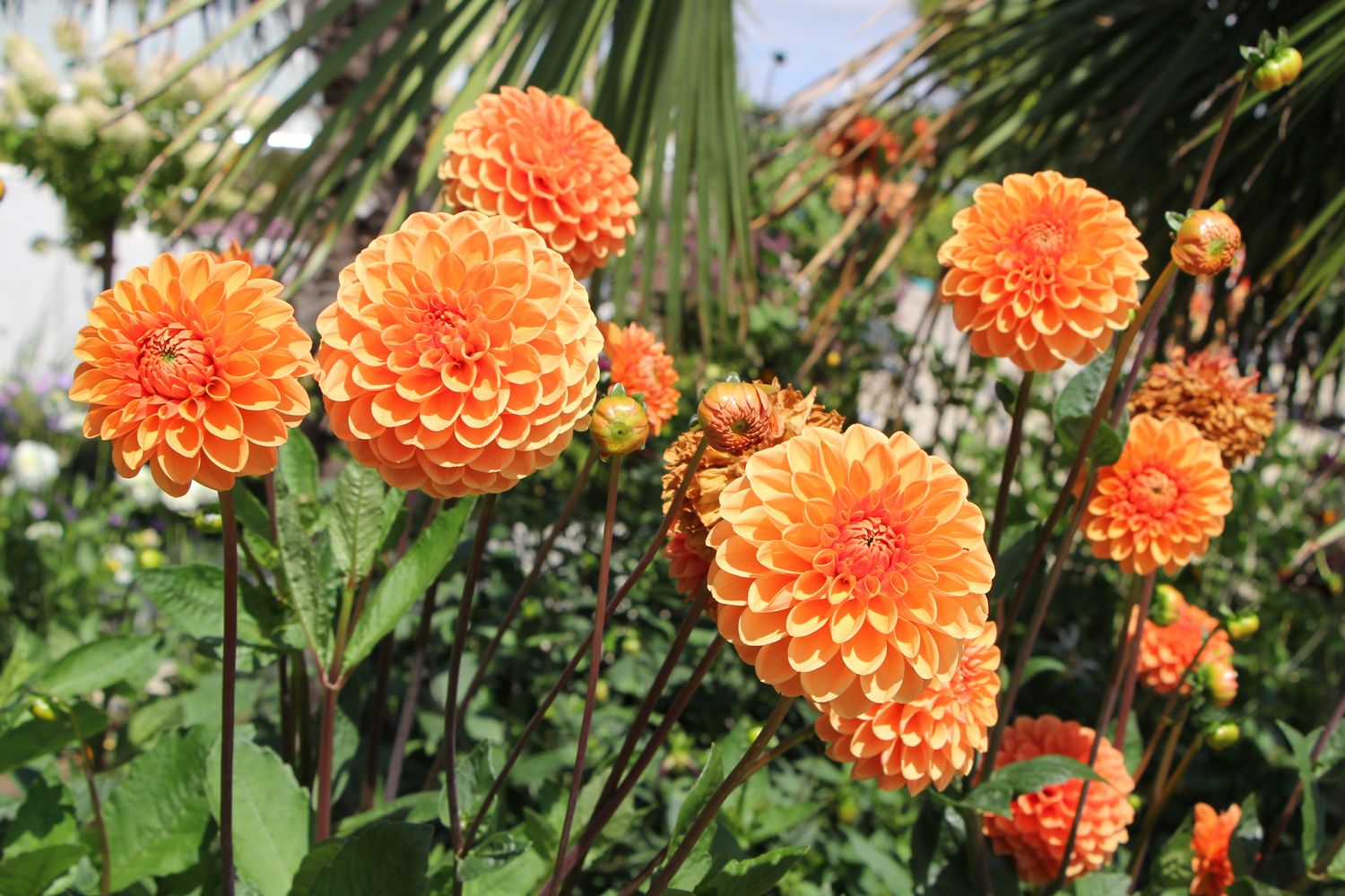 Dahlia 'Sylvia' begeistert durch strahlend orangefarbene, gefüllte Blüten. Dieser langstieligen und reichblühenden Schönheit werden die Herzen der Schnittdahlien-Liebhaber zufliegen.
