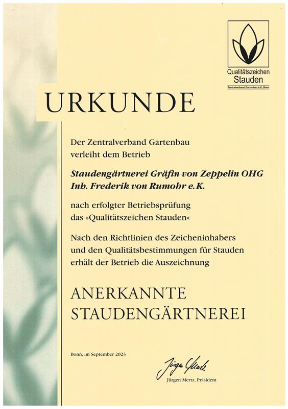 Der Verband deutscher Staudengärtner hat ein Gütesiegel entwickelt, das „Qualitätszeichen Stauden“. Jeder, der es führt, muss seinen Betrieb alle drei Jahre nach festgelegten Kriterien prüfen lassen. Um irgendeiner „Vettern-Wirtschaft“ vorzubeugen, darf nur eine Prüfungskommission aus Norddeutschland Betriebe in Süddeutschland prüfen. Zudem ist immer ein unabhängiger Fachmann vom Landwirtschaftsamt Mitglied dieser Kommission. »Mit diesem Siegel zeigen wir Ihnen, dass sich hinter unserem schönen Onlineshop auch eine fachlich gut geführte Gärtnerei verbirgt «