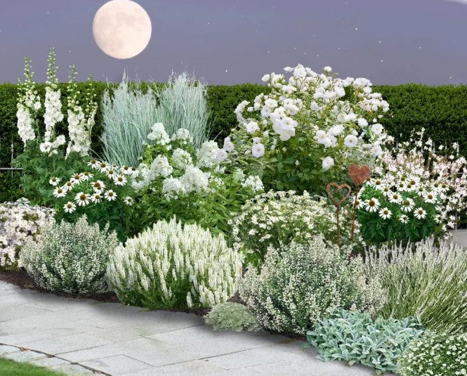 Trotz zurückhaltender Farbgebung in Weiß und Silbertönen besitzt das Beet eine ungeahnte Strahlkraft, die bis weit in die Abenddämmerung hinein anhält.